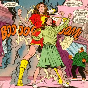 whose publication in Fawcett Comics began only a year after Siegel and Shuster's creation. While kids loved Superman, there was something easy to identify with in the adventures of Captain Marvel. After all, Captain Marvel was a kid too. Young Billy Batson wasn't a grown-up Alien like Superman's Clark Kent. Billy was a little boy from the old US of A who balanced school with a part-time Radio News reporting Job. But when the Wizard named Shazam gave Billy the wisdom of Solomon, the strength of Hercules, the stamina of Atlas, the power of Zeus, the courage of Achilles, and the speed of Mercury, everything changed for Billy! From that point on, any time Billy said one magic word he could become the Superhero Captain Marvel at will. That magic word was "Shazam!" (showing the Wizard had a bit of an ego) and the lightning bolt it summoned was the source of Captain Marvel's change to and from ordinary Billy Batson! The best part? Billy was still Billy even with these godlike powers! What could be better for a kid to read about? Just like the reader, Billy was a young boy, but with only an incantation he could become a god. What's more, Billy the character narrated his own stories, talking to his readers like good buddies he was letting in on a big secret.