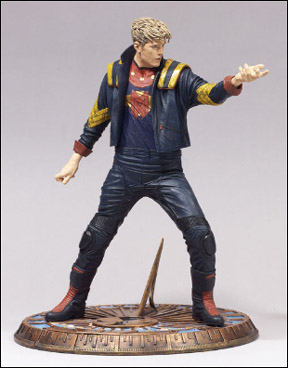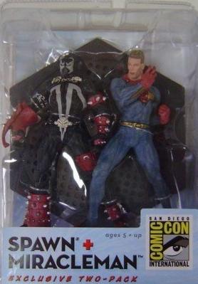 The saga continues however, and Todd McFarlane is not saying Die just yet. In 2003 (after the lawsuit had been won by Gaiman), McFarlane Toys released an "Extremely Limited Edition Cold-Cast Resin" Statue of Miracleman, seemingly based on the cover to Miracleman #1, though differences are notable. I have one right here with me, by the way. On the underside of the box is the fine print that reads: "Miracleman is a trademark of Todd McFarlane Productions, Inc. The Miracleman action figure is (copyright) 2003 Todd McFarlane Production [sic]." That same year a promotional action figure was released only at the San Diego Comic Con of Miracleman (packaged with a Spawn Action Figure) from the same molding (and carrying the same fine print).