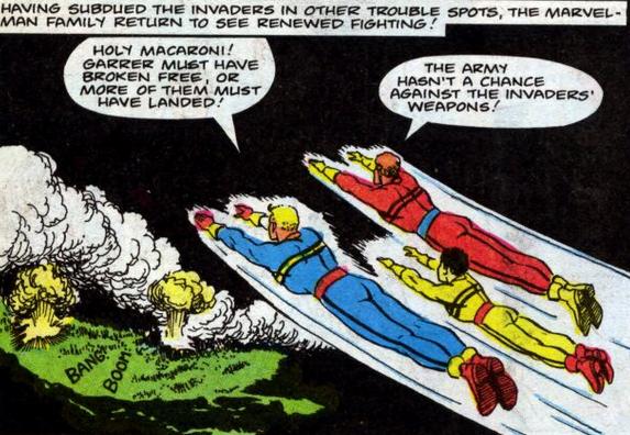 | Above: The gang's all here! Mary Bromfeld (Alias: Captain Marvel/ Mary Marvel), Freddy Freeman (Alias: Captain Marvel Junior), and Billy Batson (Alias: Captain Marvel) |