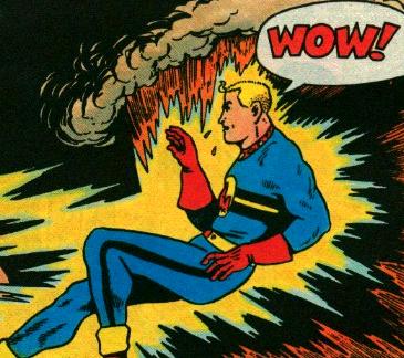 Below: Because THAT version was too original, the character was soon given a red costume with a Yellow symbol on the chest. But at least he didn't walk as a teenager by day until magically summoned during times of trouble... oh, WAIT, he did that too!