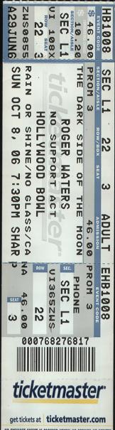 The Wall, Animals, Wish You Were Here... they're all practically masterpieces... but The Dark Side of the Moon (at the time of this writing, the best selling album of all time) is the indescribable, inspired, inspiring and still poignant Concept Album that somehow improves with age (both the album's and the listener's). There are certain lyrics that I simply didn't "get" as a younger man... not really. The Dark Side of the Moon might as well be considered the soundtrack to the Self-Aware. All of the lyrics and the majority of all the music was written by Roger Waters, and both the music and the lyrics seem to mean more every year. So when I found that Roger Waters had launched "The Dark Side of the Moon" Tour in 2006, did I think I might like to go to the show? You Flex your Rod, Fish takes the Hook! It sold out fast (I credit Roger's stalwart perseverance and the timelessness of his music that he could sell out a theatre this big for this many shows) and only by the grace of an added Sunday Show did I manage to procure my tickets. Thank you, God! The night was upon us... Michelle and I fought our way through traffic like interstellar heroes through an asteroid field to get to the Hollywood Bowl in... well, you know where it is. This was the show I had waited literally twenty years for. I thought that by the time I finally saw Any part of Pink Floyd playing "Dark Side" in its entirety, Pigs would Fly... I was right. Picture this: We're outside in the bowl, the domed stage at peace, filled only with colored light. An enormous, classic-looking radio filled the backdrop. A World War II Era prop-plane rested atop it, a bottle of Scotch flanked it and a smoking ash tray lay before it... each about the size of a house. A brobdignagian hand reached in from the side and turned the radio on (no, I wasn't tripping, the show had begun). As the hand chose a channel we heard varied oldies playing just before the proper station was selected, just in time to hear Roger's German introduction to "In the Flesh" followed by that loud, building climb of the guitar, backed by Roger Waters' skillful bass. It's amazing that song is still played out of context (check out the lyrics some time to see what I mean), but the song couldn't be more appropriate for rousing the crowd into awe-struck Frenzy. "So ya... thought ya... might like to... go to the show...", he sang as the screen behind him morphed into an army of marching crossed hammers, "To feel the warm thrill of confusion that 'Space Cadet' glow?" What other show besides Roger Waters can that be said about? Okay, Pink Floyd, but you get my meaning! Trading in his Bass for an acoustic guitar, Waters eased gracefully into "Mother", allowing one of his skilled "Guest Vocalists" take over Gilmour's part, which makes sense, as she sounded more like a "Mother" than Dave ever did. The song was incredible, as was the visual screen show accompanying it. During the line "Mother won't let Anyone Dirty get through" we were treated to some really fantastic nudity. Thank you, Roger. But wait... Both those songs were from The Wall! Right... Roger was giving a whole show here, kids, not content to give us only "The Dark Side of the Moon", then take his nap. The man is a consummate professional who seemed to still love what he's doing, even if much of it is what he's been doing for over 30 years. And that's especially counting the next song, the bleak, science fiction infused "Set the Controls for the Heart of the Sun", which was originally released just under Forty Years ago! With a fiery and astronomical (literally) visual show and the greatly appreciated 360 degree surround sound to accentuate the haunting delivery of Roger's lyrics, this was truly entrancing to see and hear. It was the perfect intro for the next three songs, all from the Barrett tribute concept album "Wish You Were Here". As the back drop changed from the Signature round disk behind the band into a full-frame image of Syd's face, the slow rise of "Shine On You Crazy Diamond" Pt. 1 filled the surrounding speakers and blossomed into the four-note riff that brings the song to fruition. Making it through the third part (of nine total pieces, usually not all played live anyway), Roger gave a fitting tribute to his friend who died on July 7, 2006, but who was lost long before then. "Shine On" gave way to "Have a Cigar". The Keyboard riff, so recognizable now, sounded incredible in the full surround experience. Meanwhile Roger's voice at 62 years of age sounded as good, if not better than ever before, especially in this vaguely disconnected, echoing song. He left little room for the question of "Which One's Pink?" to be asked. To compliment the sounds of a radio changing stations on the album, the two-story radio took the screen again at the end of "Have a Cigar". Channels were changed by the enormous hand until the opening chords of "Wish You Were Here" were heard, as played by Roger himself. It was a passionate rendition and that passion could be felt in the audio as well as seen in the face of Roger on the four Jumbotrons that adorned the venue. R.I.P. Syd. Proceeding to what is usually called the first "Roger Waters Solo Album" (though it was performed by Pink Floyd), Roger reintroduced us to The Final Cut with the song "Southampton Dock", complete with scenes from the "Video EP". This gave way to "The Fletcher Memorial Home" with imagery that now includes an apparently bombed out hospital with the portraits of the more current "Overgrown Infants" therein. The political theme continued with "Perfect Sense" (parts I and II) from "Amused to Death". The screen filled with a sports stadium filled with water. A submarine surfaced and launched a torpedo at an oil rig, destroying it to the cheers of fan and announcer alike... Hey, that's subtle, Roger! But this was only a precursor to the new track "Leaving Beirut", available on the internet, but not yet released as an album. Detailing the true story of Roger's 