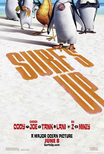 But, hey, Cars feels one trunk of a lot like a smooth hewn remake of Doc Hollywood (which was released fourteen years, one month and three weeks before Cars, not that anyone asked. Yeah, I did the math. I have that kind of mind. This... is why my boss hates me.) So, originality isn't quite what it once was, was it? I... I mean "IS it?". But again, Surf's Up does look great, and it's pretty gosh darned entertaining to boot. This brings us to one area where this Sony Pictures Animation release does show its more original side. Instead of a standard feel-good fourth-wall-secure animated flick, directors Chris Buck and Ash Brannon offer up a Mockumentary, with a heck of a lot of stops pulled to give that documentary feel without resorting to "nausea-vision" (did you watch this one, Dick City?). The look of the "camera work" (virtual, though it may be) could fool the ol' peepers into thinking this was a movie shot with hand-held cameras if the subjects weren't talking penguins, chickens and varied rodents and fowl. "Archival" footage is given a grainy look with a faithful facsimile of 1960s-era film stock. Even the "spliced-in", licensed footage (such as news coverage or X-Games action shots) is given a slicker, video-oriented look. The problem is this conceit is abandoned during some key moments in the film, leading to not only a thematic inconsistency, but an air of illogic when private moments and impossible angles are covered as if they were filmed by a documentary film crew. Yeah, yeah, yeah, it's a kids movie, but I'm not a kid's critic, gosh darn it! Hully Gee. Any silly way, the Documentary Film Crew (voiced by directors Chris Buck and Ash Brannon themselves) follows aspiring surfer (and proficient fish gutter) Cody Maverick (voiced by Shia The Cow) as he tries out for the ultimate in tropical surfing championships for Birds. This isn't only to get the shell out of rural Antarctica, but also to follow in the footsteps of his now idle Idol, the legendary Surfing Champ "Big Z". Before too much time has passed (so that the movie exceeds a four minute run time) Codeine Maverick leaves behind his loving ma Edna (Dana Belben) and obnoxious brother Glen (Brian Posehn) and follows nervous recruiter Mikey Abromowitz (Mario Cantone) and stoner surf-dude Chicken Joe (Jon Heder) to the tropics for the top of the heap of Board Shorts Sports. Sadly, once he gets there, he's not greeted by "Big Z", he's greeted by the "pecker face" who replaced "Big Z" in the good graces of Don King-like promoter Reggie Belafonte (James Woods): one Tank Evans (Diedrich Bader... he's BATMAN!). You've seen enough sports movies with enough helpings of the perennial "SPORTS TRAINING MONTAGE" to know what happens. Luckily Cody (note: NOT "Bodhi ") befriends a hot (for a Penguin) lifeguard named Lani (Zooey Deschanel) and her part-Yoda, part-Norm-from-Cheers uncle Geek (Jeff Bridges).It's funny, yes, but predictable and it relies an awful lot on "What'd he say?" shock value and scatological humor to keep the LCD crowd laughing like mad. But in many cases, Surf's Up can be pretty clever, from subtle sight gags to comical in-jokes and obscure references, one has to wonder which of the four credited writers (Lisa Addario, Christian Darren, Don Rhymer and Joe Syracuse) went "high minded" behind the backs of the other three. Fans of the sport might appreciate the presence of the real pros and announcers of the Wave-Riding game (again, like Cars to NASCAR) Kelly Slater, Rob Machado and Sal Masekela. On the subject of cameos, the experienced ear might recognize Brian Benben, Jane Krakowski and Michael McKean in the cast. And... unlike that other "Surfer" movie this summer, it knows when to take itself seriously and when to just be goofy. It's hard not to like Surf's Up, at least in a popcorn and candy kind of way, but it's also hard to advocate more than Three Stars out of Five, tubular Quiksilver or no tubular Quiksilver. Now, if you'll excuse me, I'm gonna go buy Blue Crush on DVD. Sure it's not the best surfer movie out there, but it does have quite a lot that Surf's Up lacked. QUITE a lot! See you in the next wet, splashing reel. |